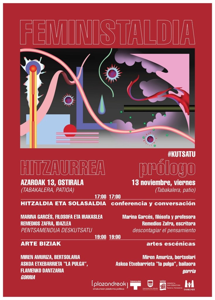 Feministaldiko edizio honetan, proiektua aurkezteaz eta etorkizun bizigarriago baten aldeko fabulazioen oinarrian dauden herri egitasmoen jarduna ezagutzera ematez gain, ahots gora irakurriko ditugu kontakizun hauetako pasarte batzuk. «Kantatu, hobe da etortzen bazara, zure ahotsa behar dugu, hirian ikusi nahi zaitu», dio Olaiak, Zirriborroak eta gero bildumako kontakizun batean.